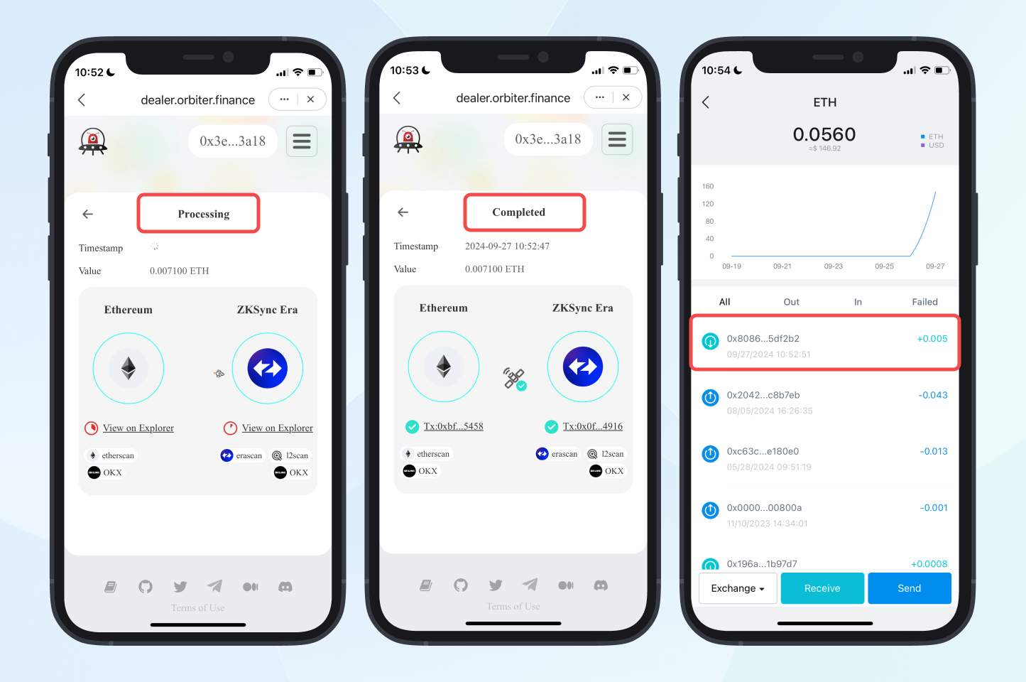 - Wait for the status to change from "Processing" to "Completed," and for three green checkmarks to appear below, indicating that the transaction is complete. Then, return to the imKey homepage, switch to the zkSync Era network, and you will be able to see your assets.